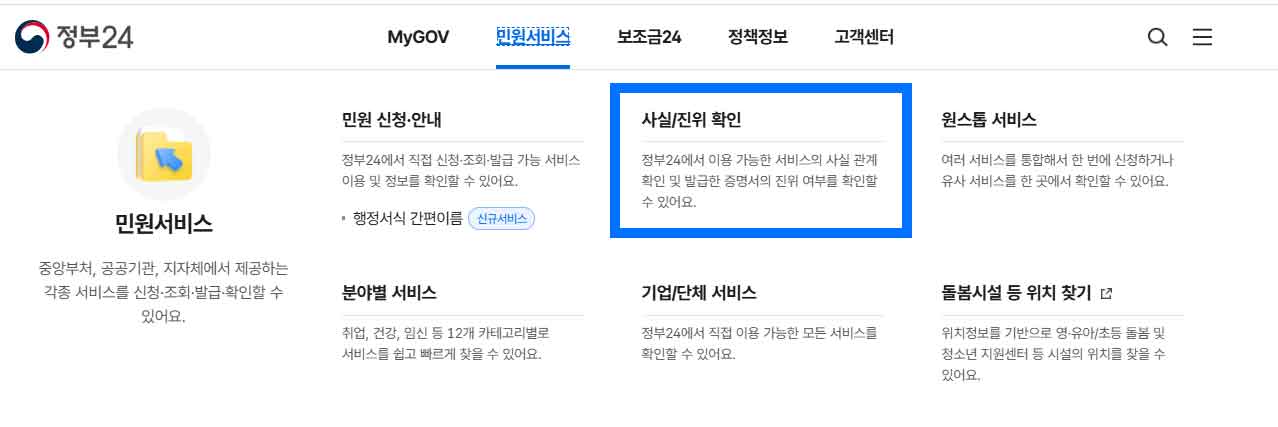 - 상단 메뉴에서 '민원서비스' > '사실/진위확인' 선택
