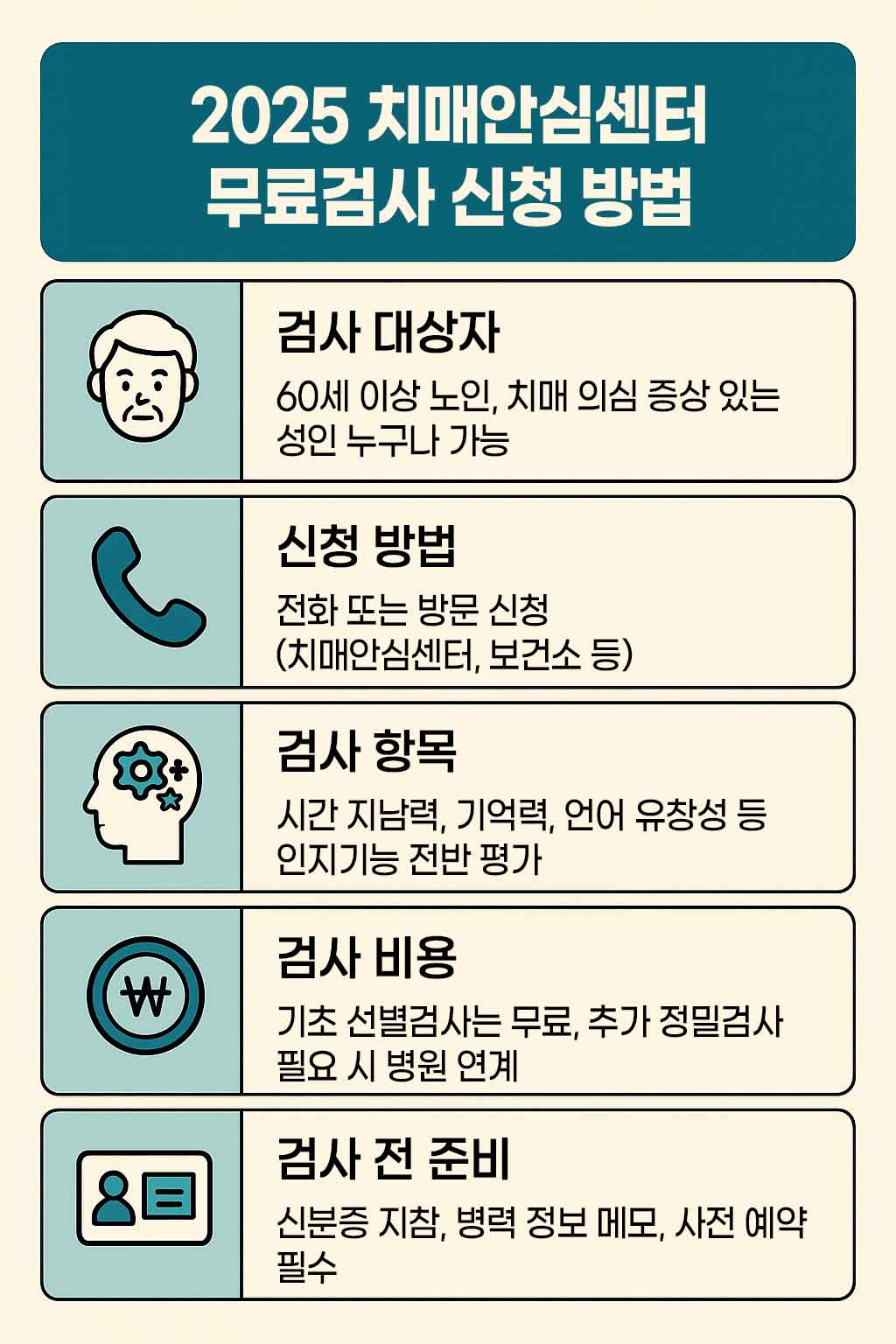2025 치매안심센터 무료 검사 신청 방법 요약 인포그래픽