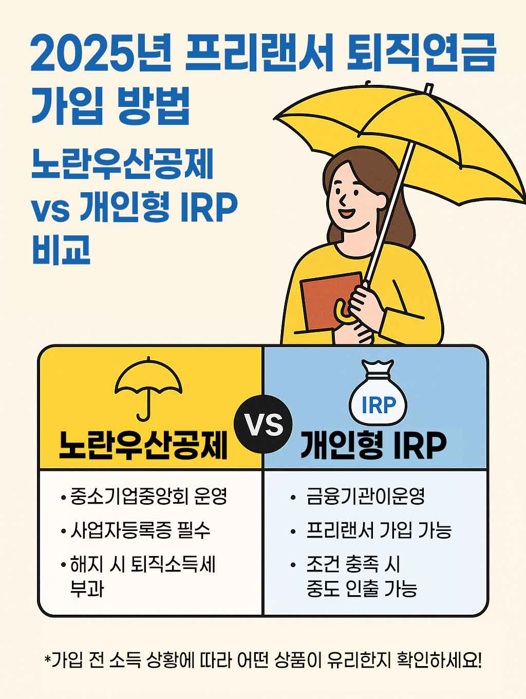2025년 프리랜서 퇴직연금 가입 방법 | 노란우산공제 vs 개인형 IRP 비교