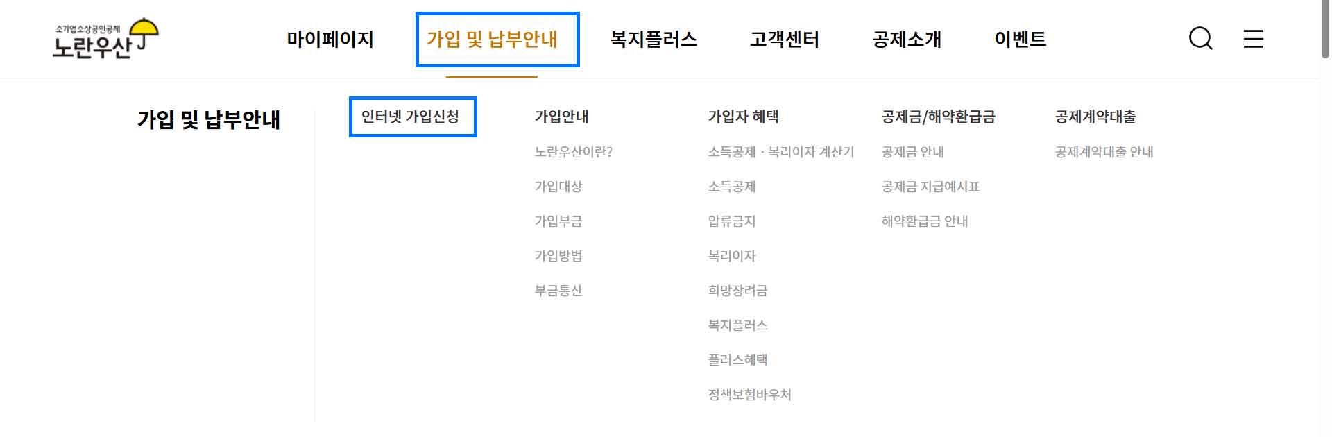 노란우산 홈페이지 가입신청 메뉴 스크린샷 화면