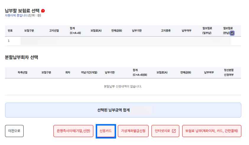 지역가입자: 고지서에 ‘신용카드 납부 가능’이라는 문구가 있는 경우에 한해 가능합니다. 단, 자동이체는 지원되지 않으며 매월 본인이 직접 납부 절차를 진행해야 합니다.