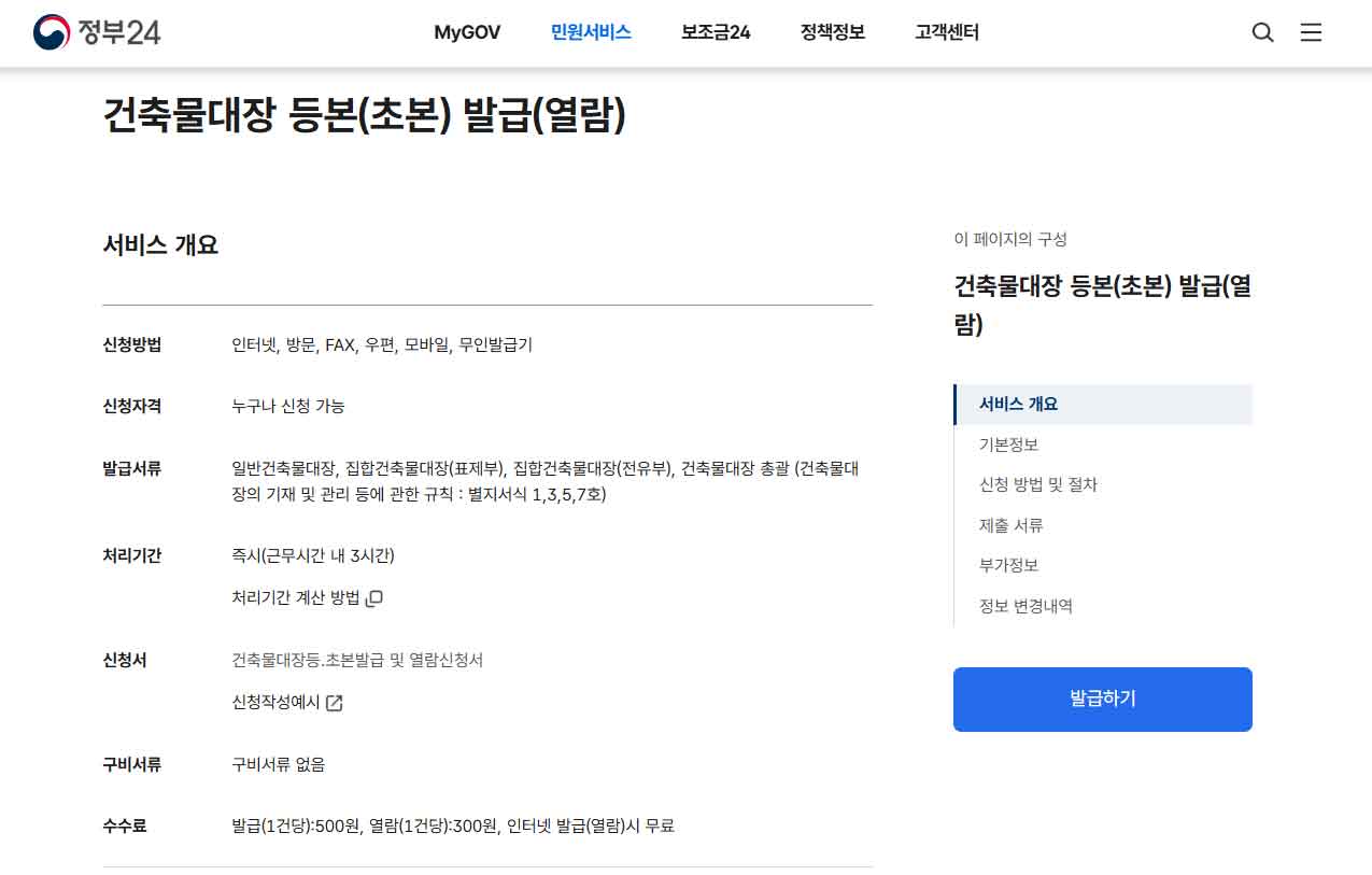 정부24 건축물대장 발급 페이지 스크린샷 화면