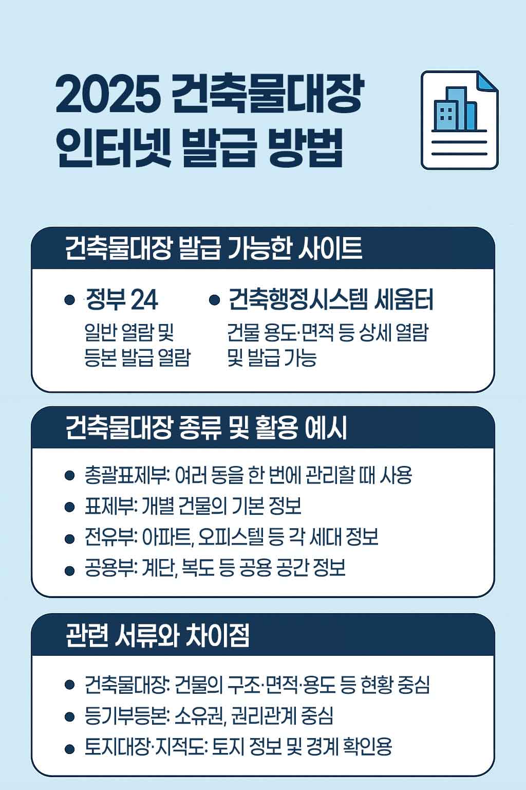건축물대장이 처음이라면, 아래 인포그래픽을 먼저 보시고 전체 흐름을 쉽게 파악해 보세요.