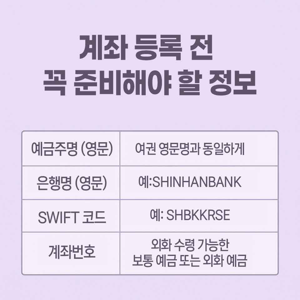 영문으로 된 예금주명, 은행명과 SWIFT코드, 계좌번호 등 계좌 등록 전 꼭 준비해야 할 정보 목록입니다.