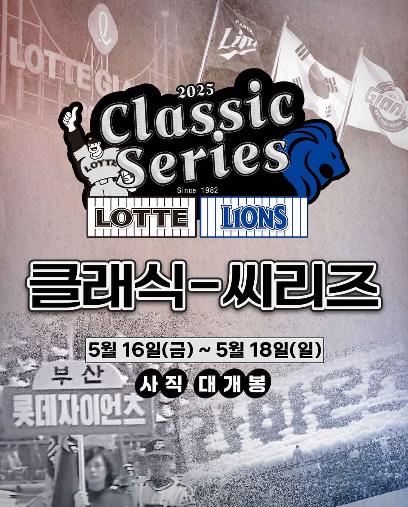올해는 5월 16일(금)부터 5월 18일(일)까지, 부산 사직야구장에서 롯데자이언츠와 삼성라이온즈가 3연전을 펼칩니다.