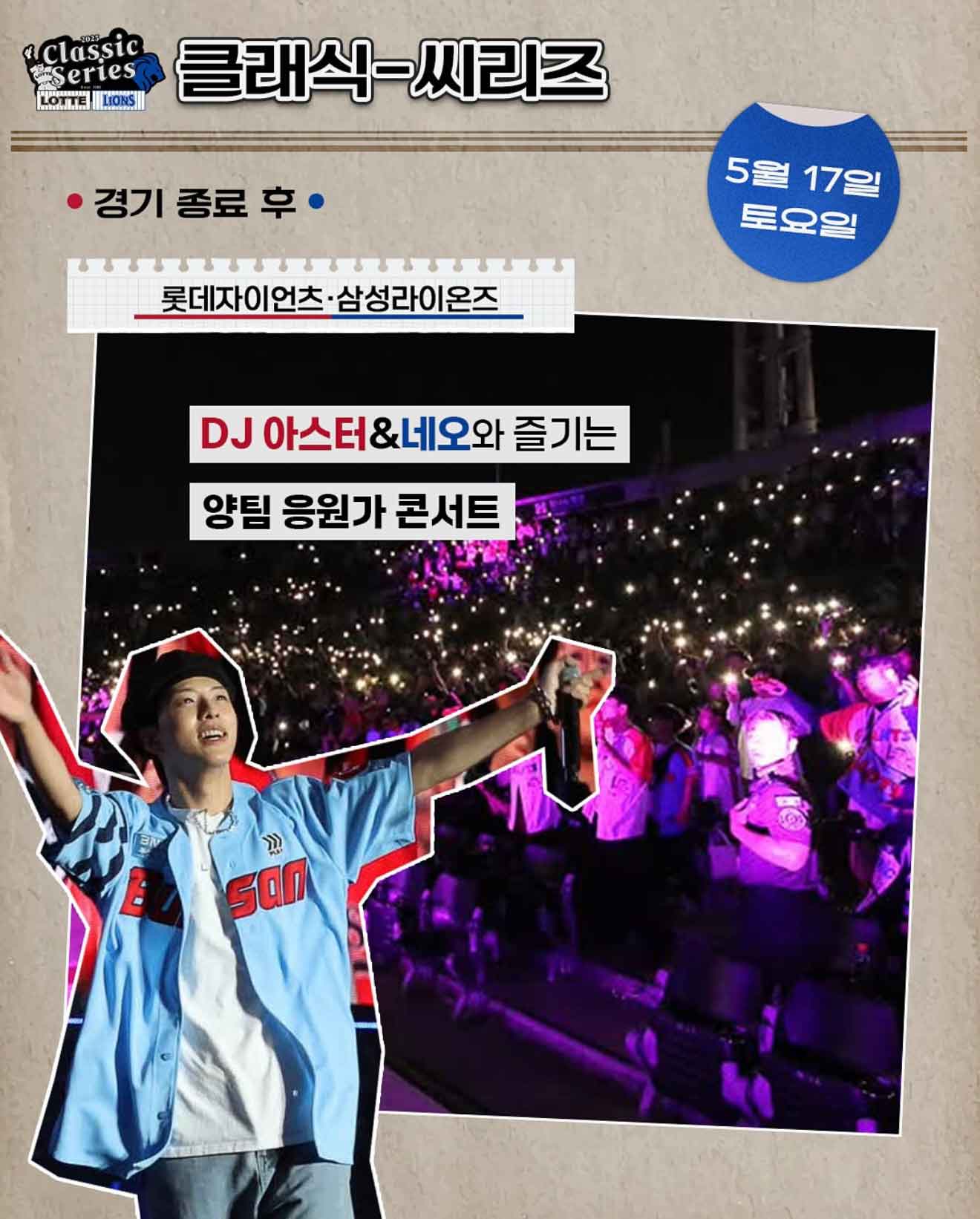 5월 17일(토)에는 DJ 아스터 & 네오가 함께하는 양 팀 응원가 콘서트가 예정돼 있어 응원의 열기를 무대 위에서 다시 만날 수 있습니다.