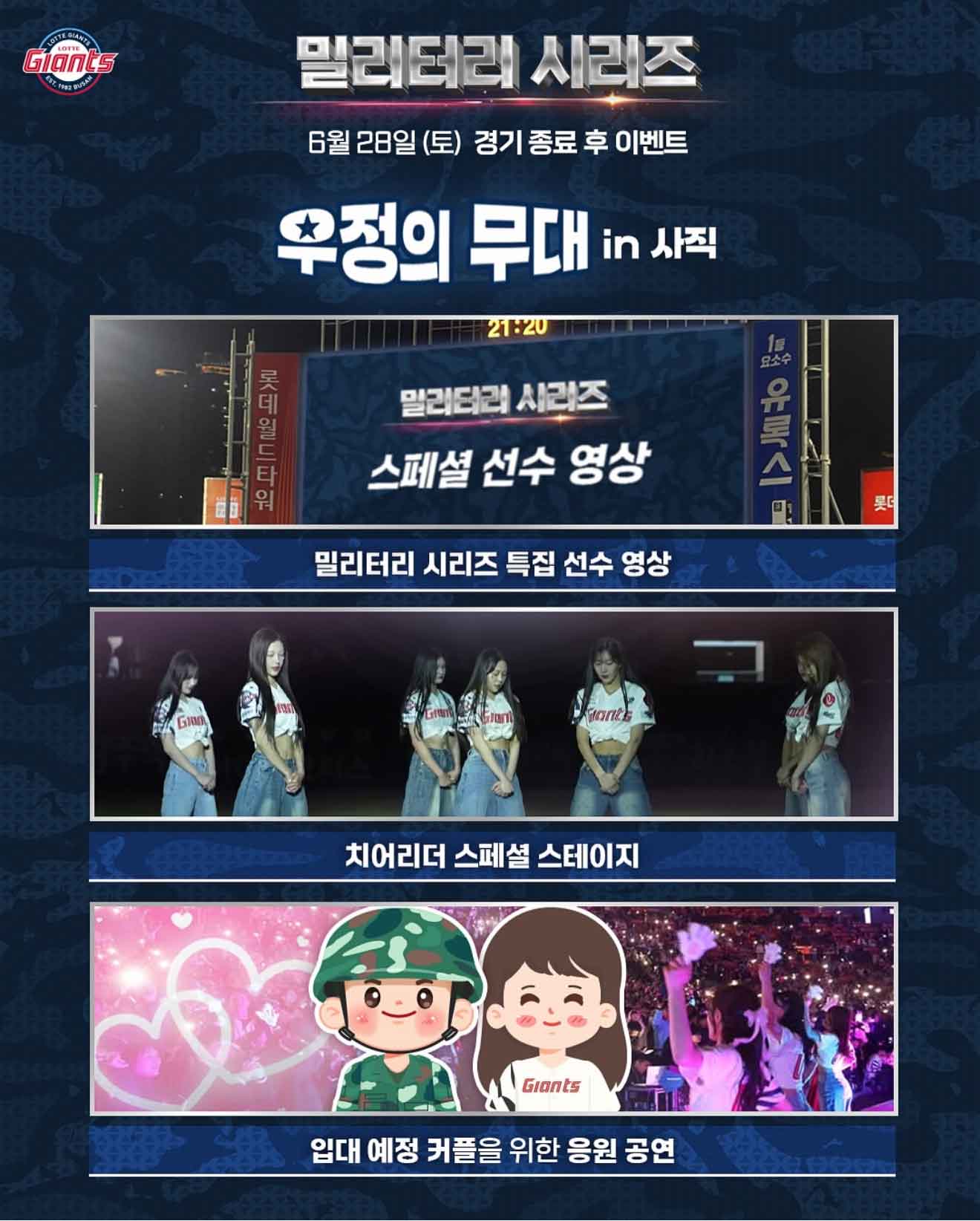 이번 시리즈는 전 선수단의 밀리터리 유니폼 착용은 물론, 시구·시타 출연진, 치어리더 스페셜 무대, 커플 응원 공연 등 다양한 이벤트로 팬들을 맞이할 예정이에요.