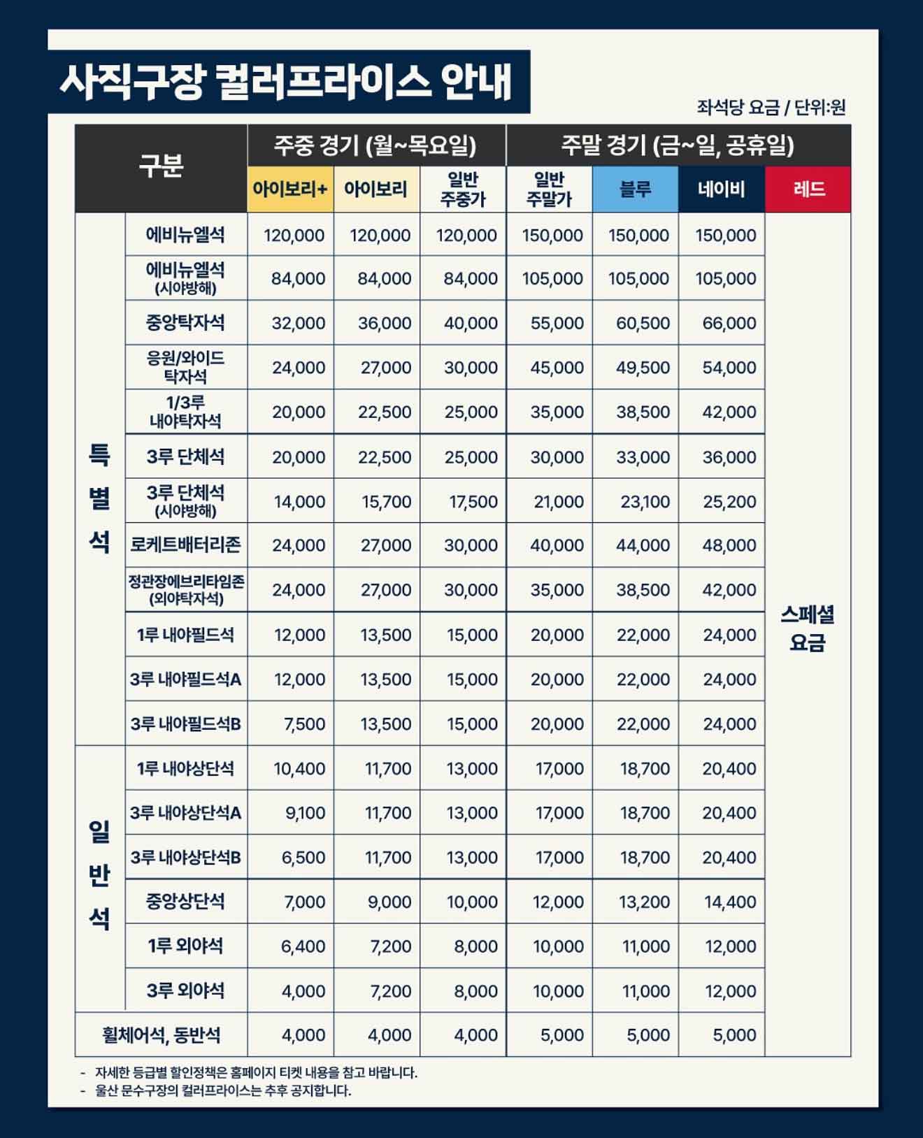 사직구장은 다양한 좌석 옵션을 제공합니다. 대표적으로는 ‘에비뉴엘석’, ‘중앙탁자석’, ‘내야상단석’, ‘ 중앙상단석’, ‘외야석’ 등이 있으며, 요일과 경기 중요도에 따라 컬러프라이스 요금제가 적용됩니다. 컬러프라이스 구분은 다음과 같습니다: