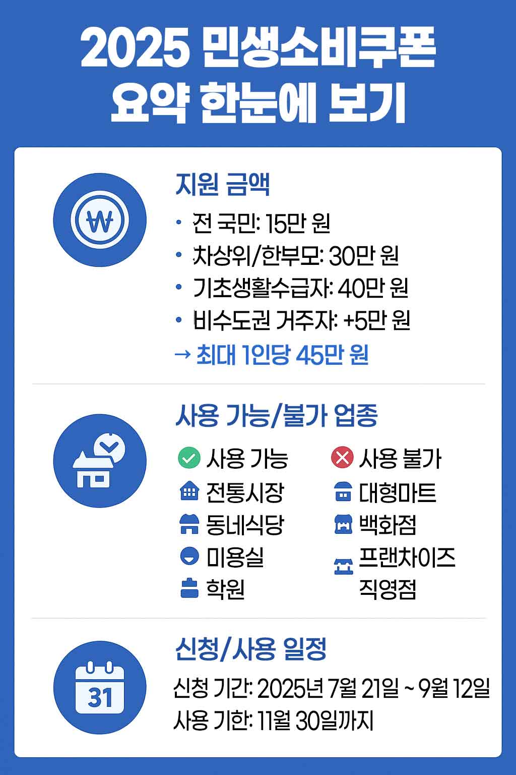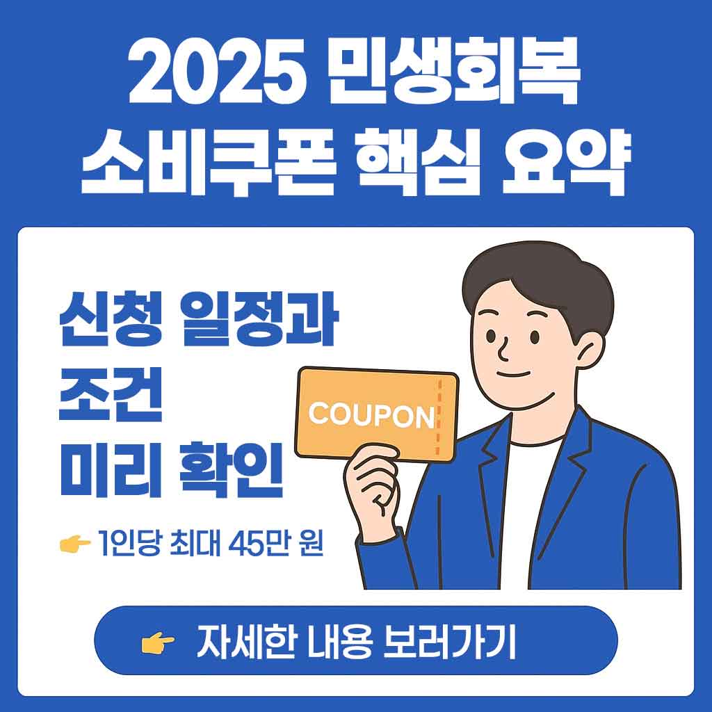 안녕하세요. 최근 정부가 발표한 2025 민생회복 소비쿠폰이 본격적으로 지급됩니다. 고물가와 경기 침체로 가계 부담이 커진 요즘, 정부가 전 국민을 대상으로 최대 45만 원의 소비 지원금을 지급한다고 밝혀 큰 관심을 끌고 있습니다. 이 글에서는 신청 대상, 지급 일정, 사용처 조건, 신청 방법, 주의사항까지 꼭 알아야 할 정보를 한눈에 정리해 드립니다.