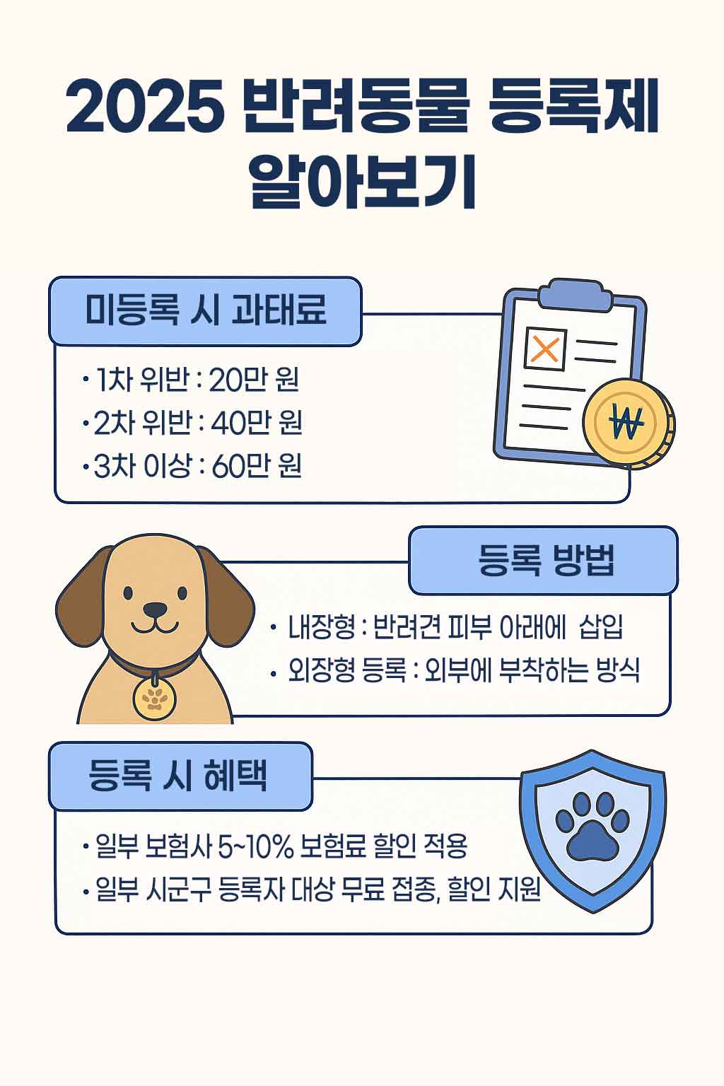 안녕하세요, 반려동물과 함께 생활하시는 보호자 여러분! 혹시 아직 반려견 등록을 하지 않으셨다면, 올해부터는 꼭 체크하셔야 합니다. 2025년에도 반려동물 등록제는 의무이며, 미등록 시 과태료가 부과될 수 있고 보험 가입 시 할인 혜택에도 영향을 줄 수 있습니다.