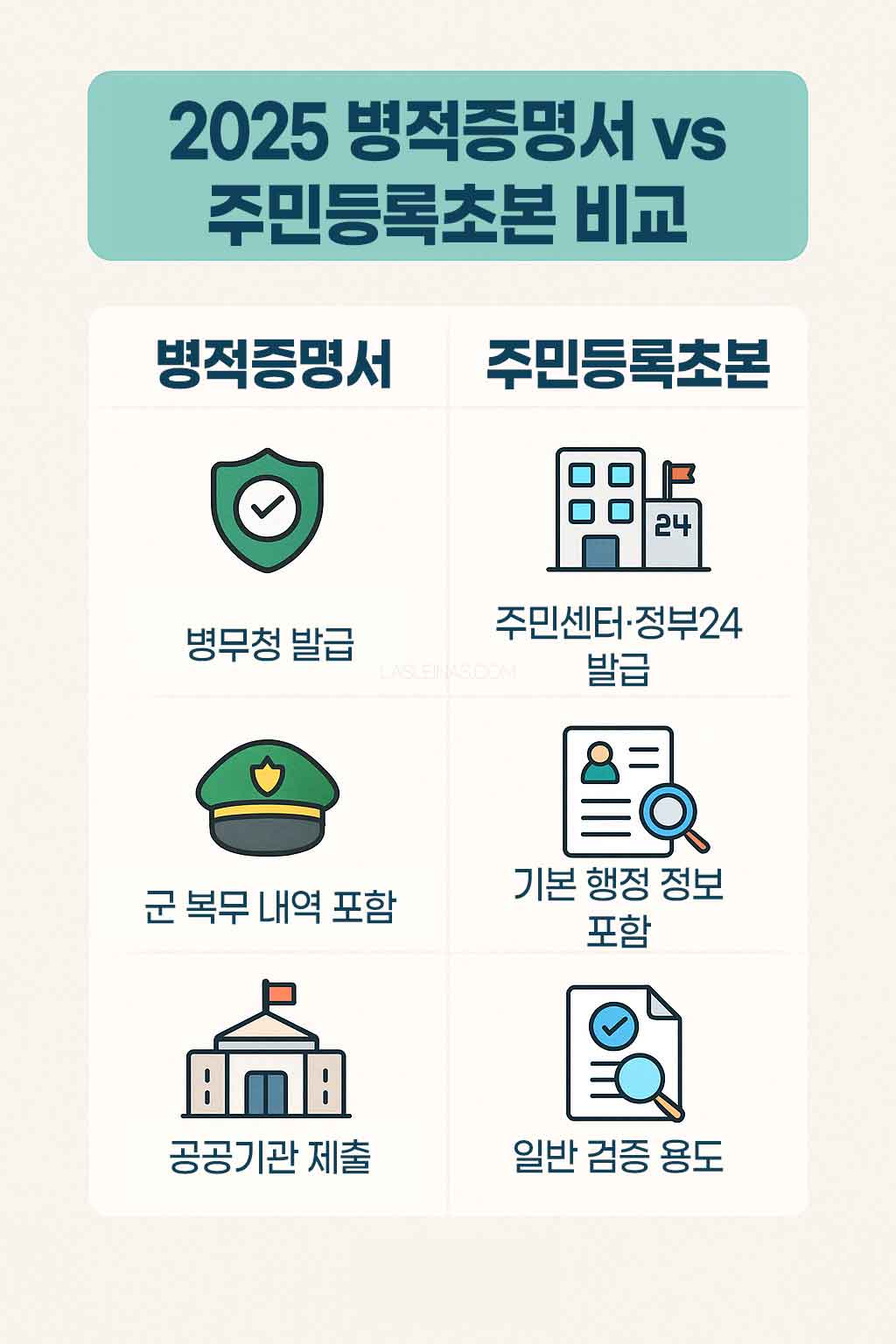 병적증명서와 주민등록 초본 차이를 비교한 이미지.
