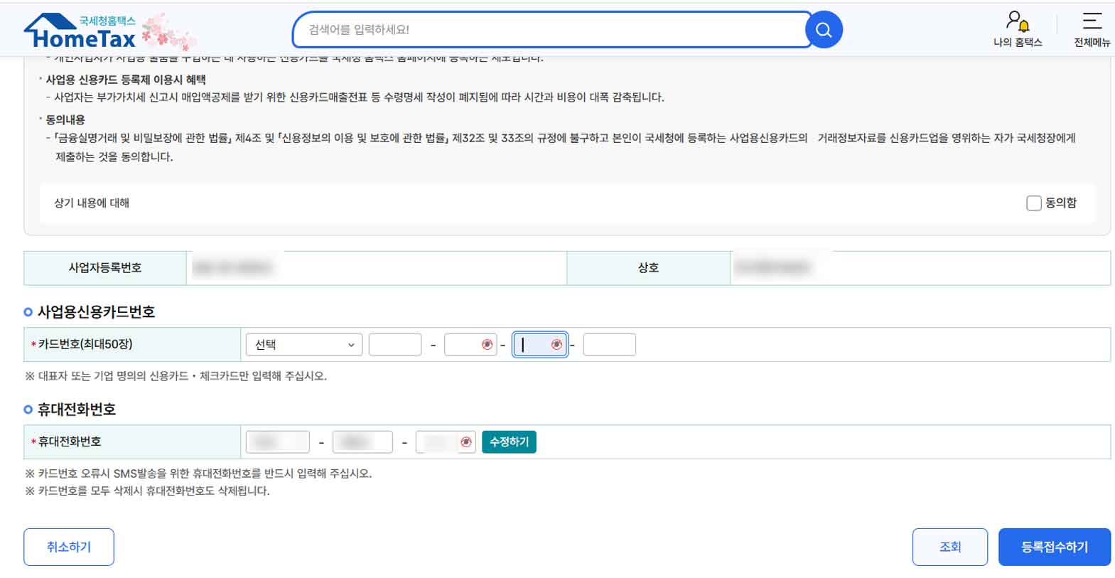 홈택스-사업용 신용카드 등록 및 조회-정보 입력 후 등록하기