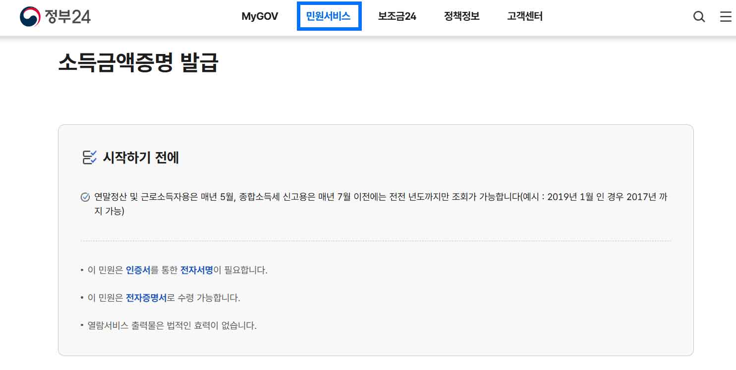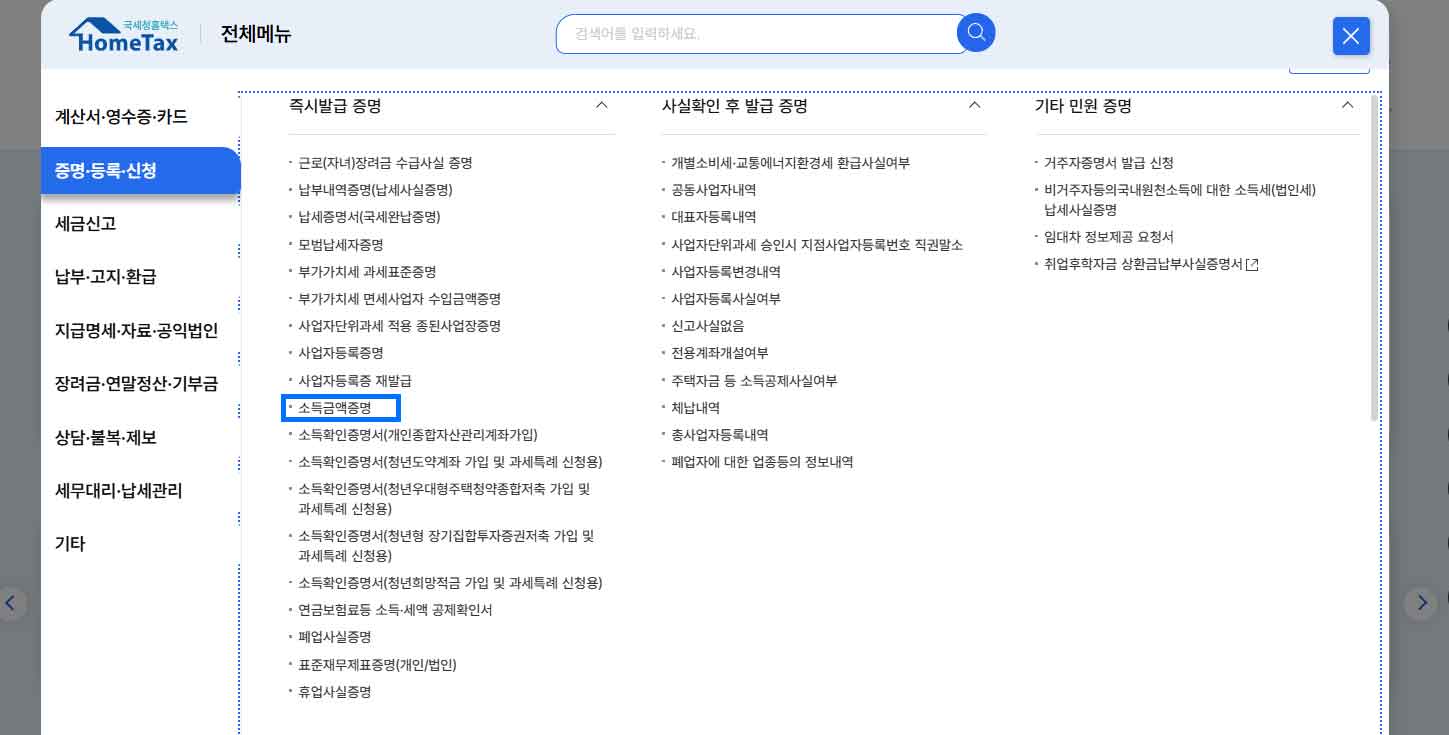 - '민원증명' 메뉴에서 ‘소득금액증명’ 선택