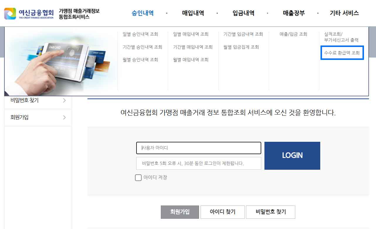 여신금융협회 가맹점 매출거래 정보 통홥조회서비스 홈페이지 내 수수료 환급 조회 메뉴 스크린샷 화면