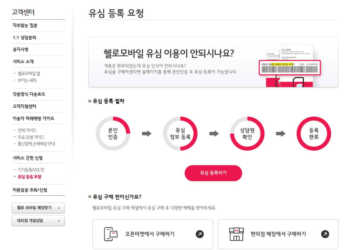 1. 홈페이지 → 고객센터 → 서비스 간편 신청 → 유심등록 요청