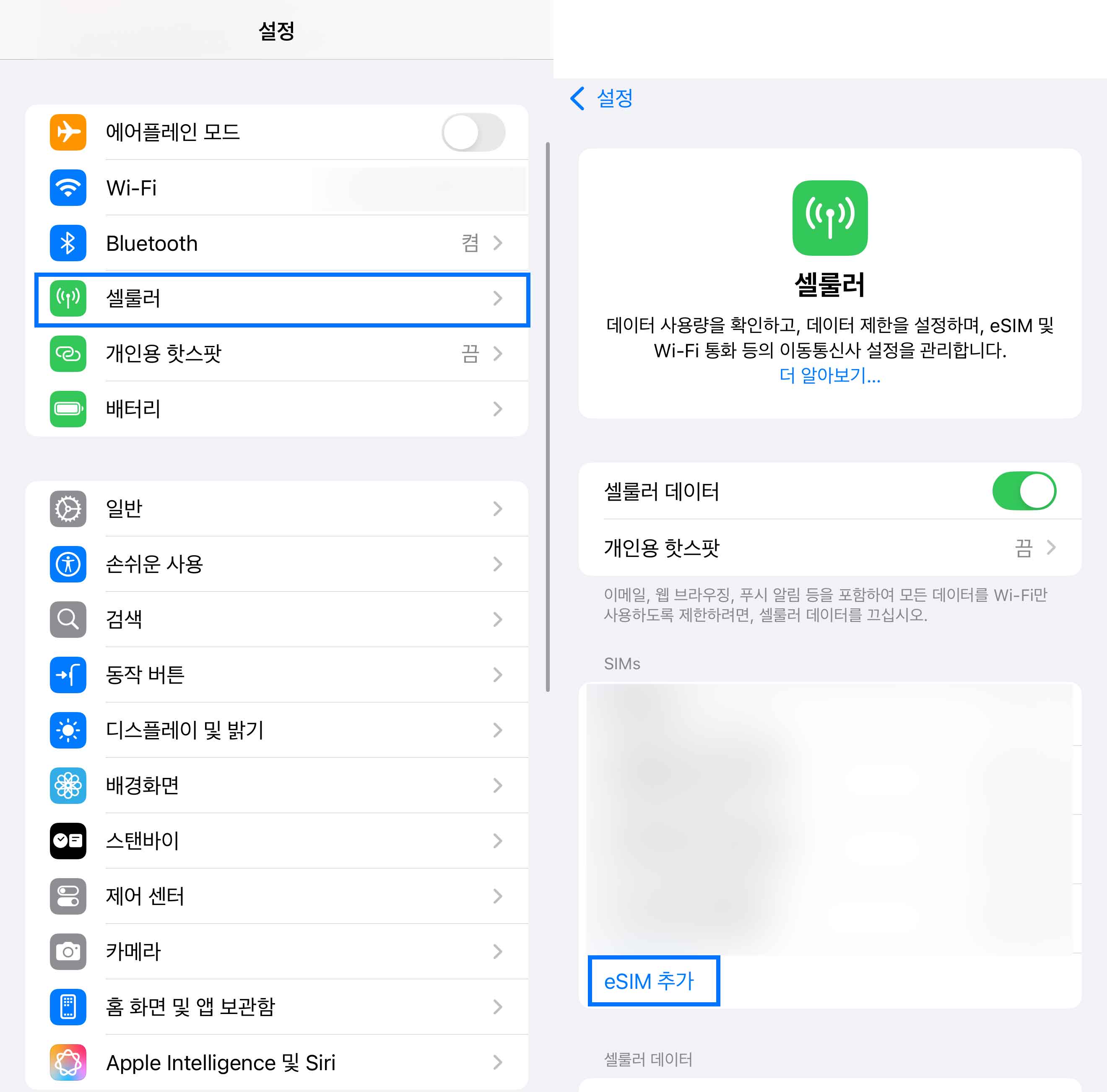 아이폰: 설정 > 셀룰러 > eSIM 추가 > QR코드 스캔 또는 앱 연결