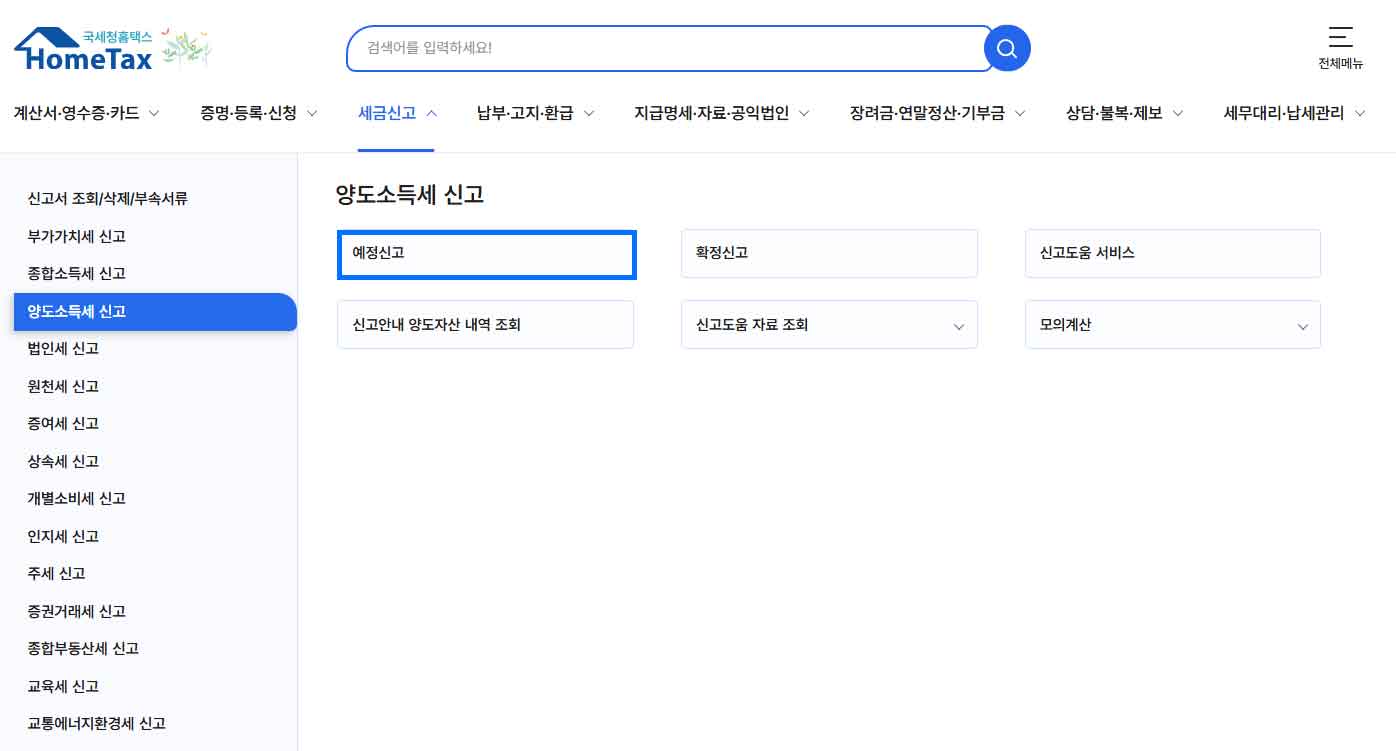 홈택스 양도소득세 예정신고 메뉴 화면