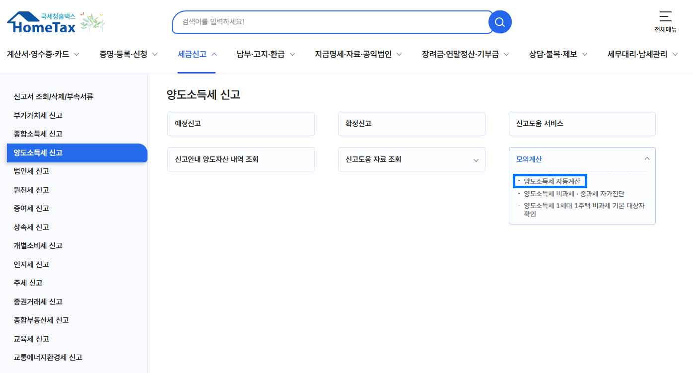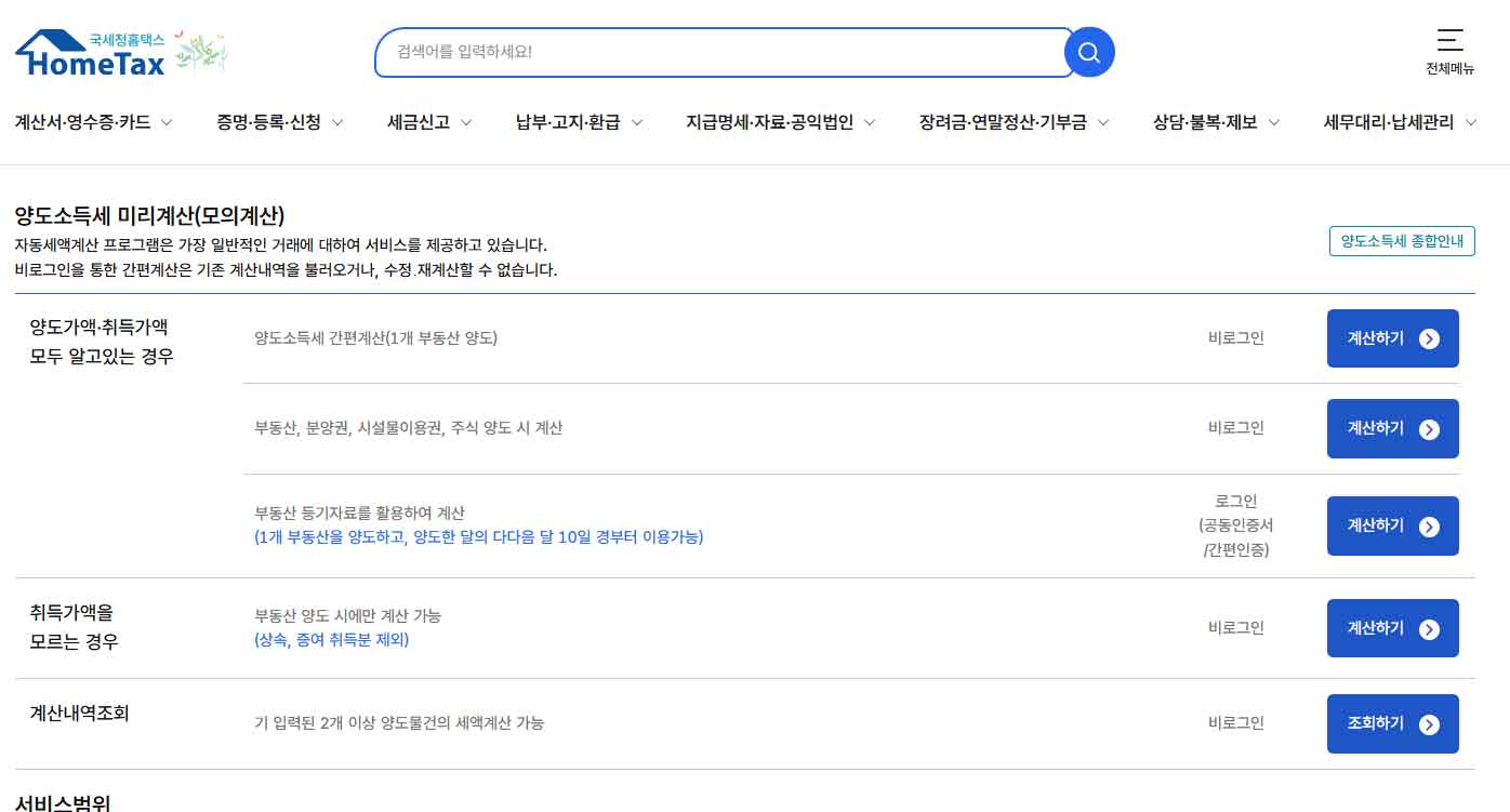 따라서 사전에 국세청 홈택스에서 제공하는 ‘양도소득세 모의계산기’를 활용해 보는 것이 유리합니다.