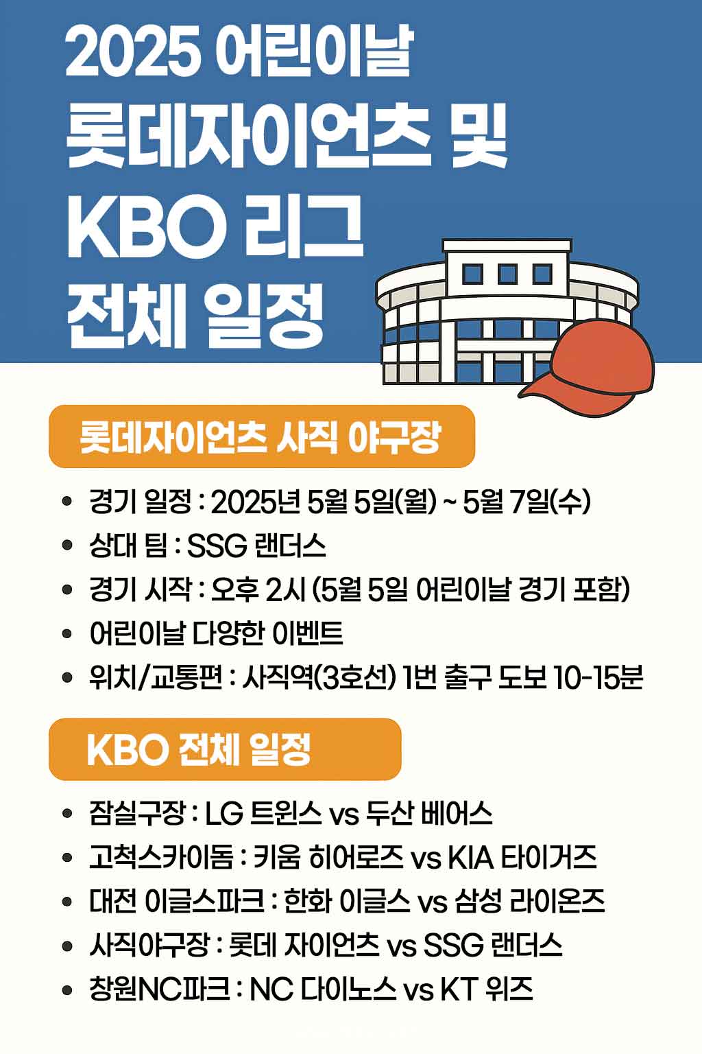 오늘은 2025년 어린이날 사직야구장 예매 일정과 KBO 전국 경기 일정을 함께 정리해 드렸습니다.