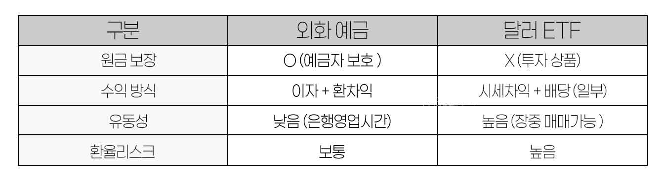 해외여행 후 남은 달러, 또는 달러로 자산을 운용해보고 싶은 분들 많으시죠? 그럴 때 가장 대표적인 선택지는 외화 예금과 달러 ETF입니다. 하지만 두 상품은 성격이 전혀 다르기 때문에 목적과 투자 성향에 따라 잘 골라야 해요. 이 글에서는 외화 예금과 달러 ETF의 차이점과 장단점 비교를 친절하게 정리해드릴게요!