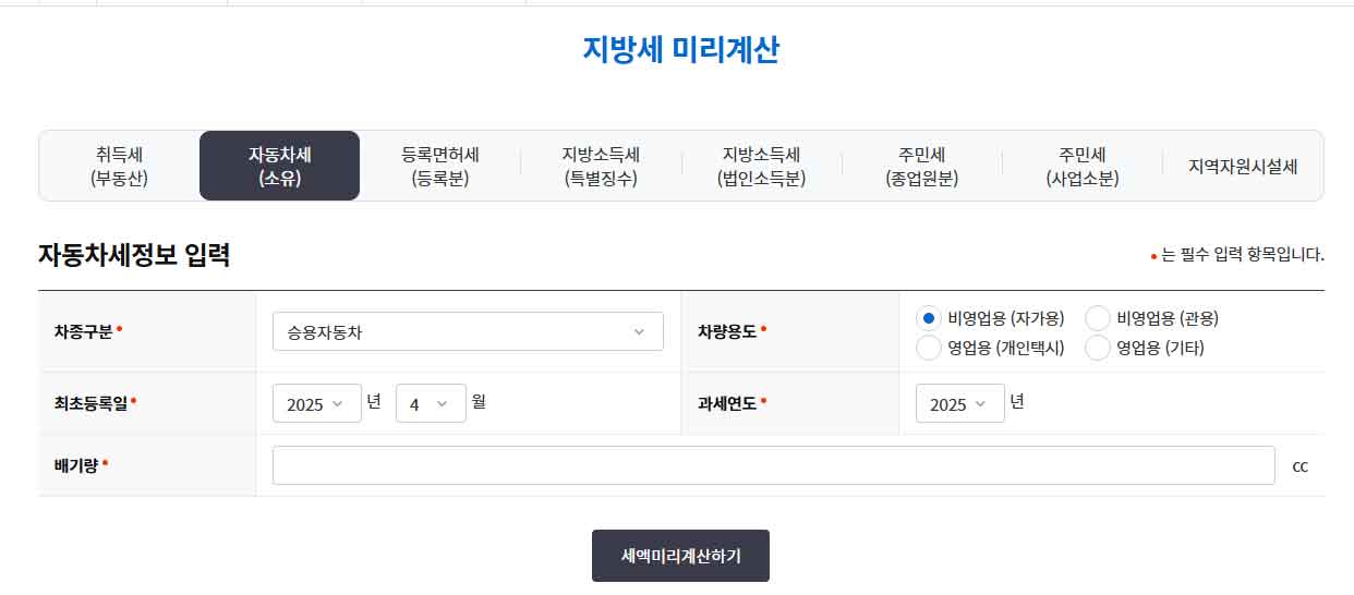 자동차세액 미리 계산 화면