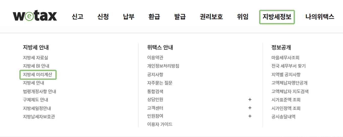 위택스 홈페이지 접속 후 [지방세정보]-[지방세 미리계산] 선택