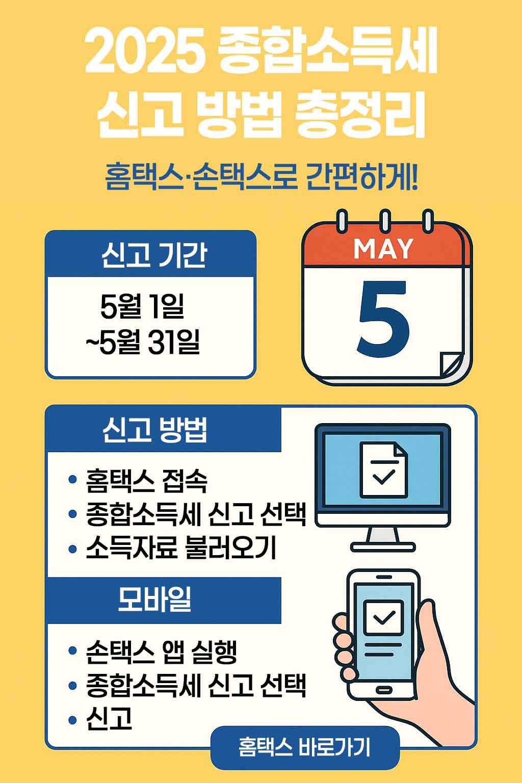 오늘은 2025년 기준 종합소득세 신고 기간과 홈택스를 통한 간편 신고 방법을 정리해드리겠습니다.