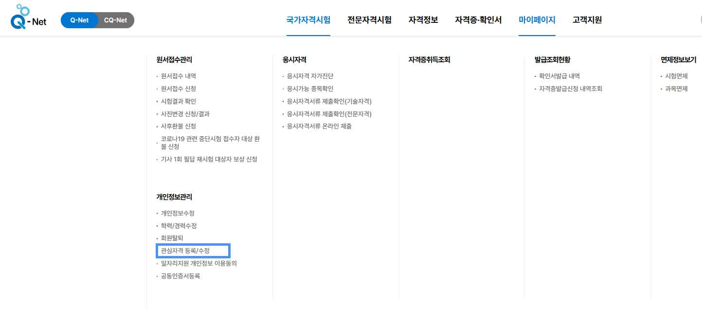 관심 자격증 등록 방법: 마이페이지 로그인 후 '관심자격등록/수정'