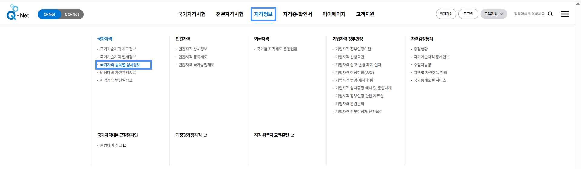 1. 상단 메뉴에서 '자격정보'-'국가자격 종목별 상세정보'
