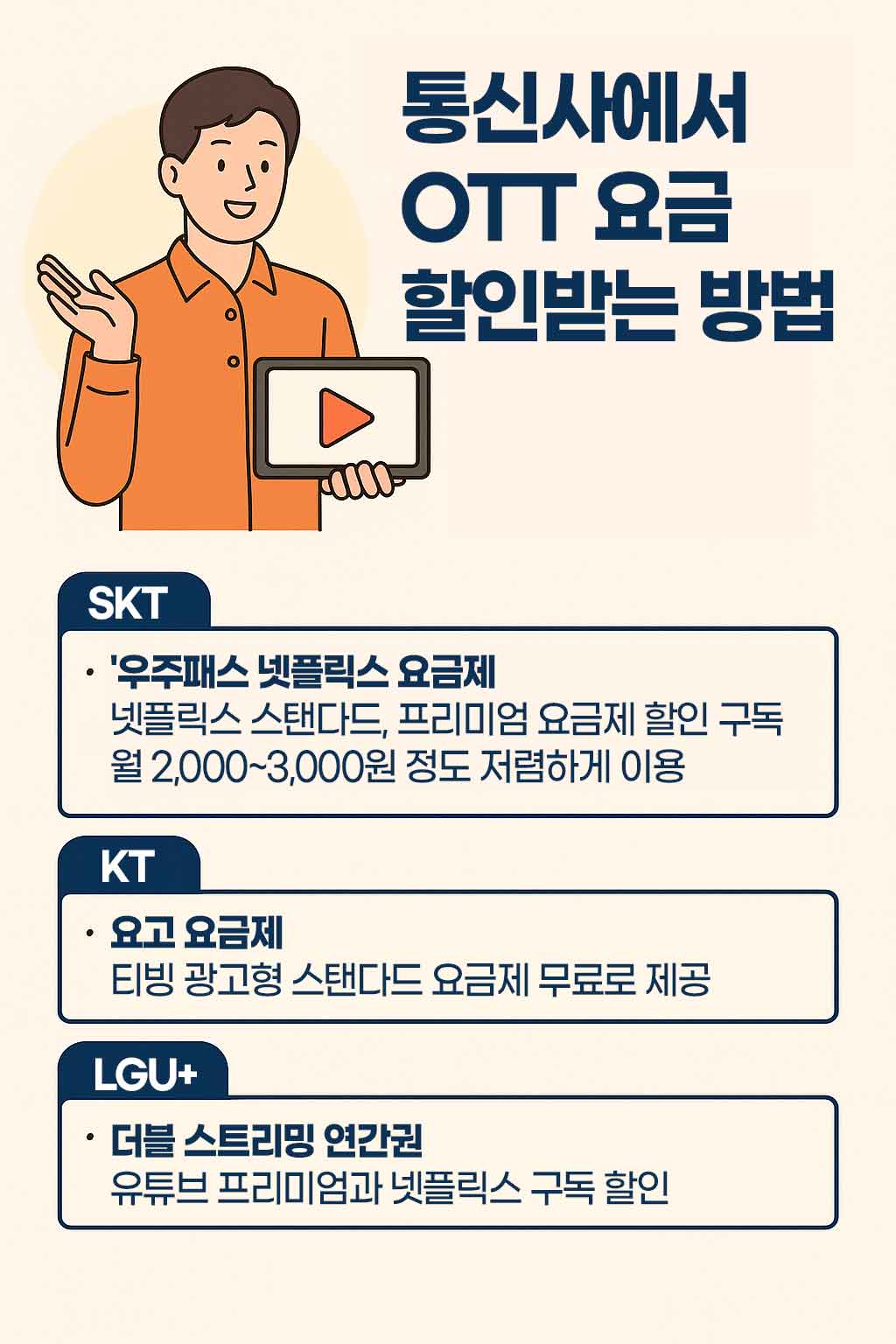 SKT, KT, LG U플러스에서 제공하는 2025 OTT 요금 할인 정보를 한눈에 정리했습니다.