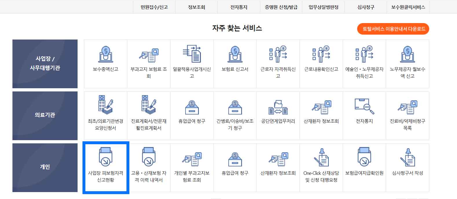 고용산재보험토탈 서비스 고용보험 가입이력 확인 메뉴