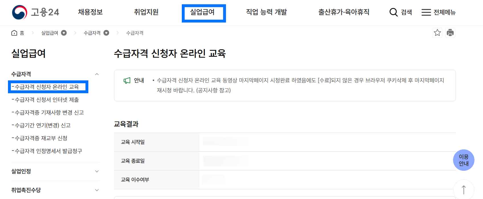 이 교육은 고용보험 홈페이지 → 로그인 → 실업급여 → 수급자격 인정자 온라인 교육 경로로 접속 가능합니다.