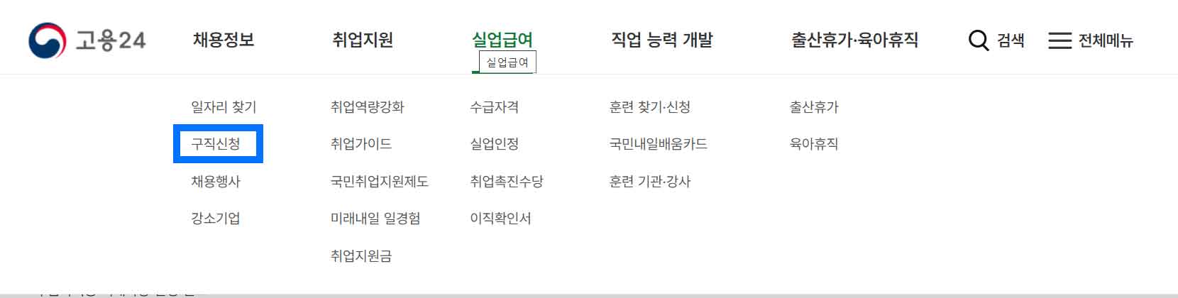 고용24 홈페이지 구직신청 메뉴 화면