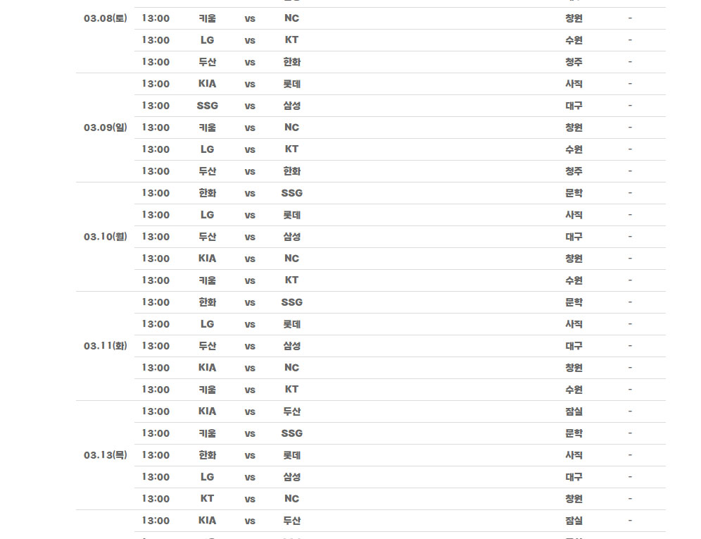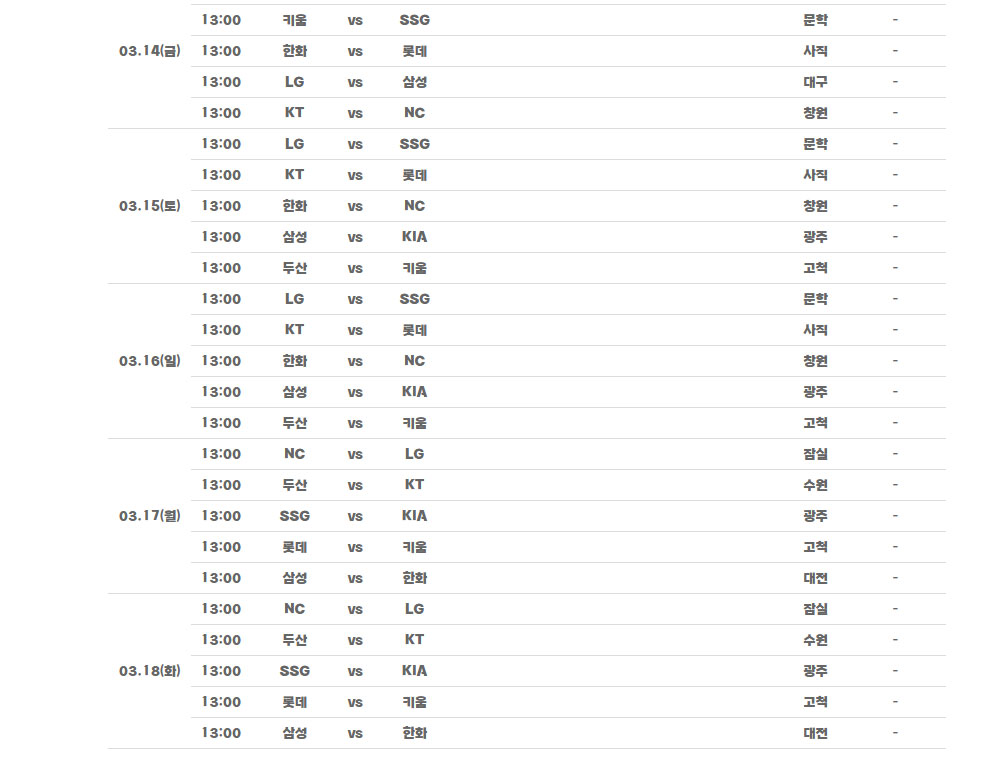 수원(LG-KT), 청주(두산-한화), 대구 (SSG-삼성), 사직(KIA-롯데), 창원(키움-NC), 구장에서 열리게 됩니다.