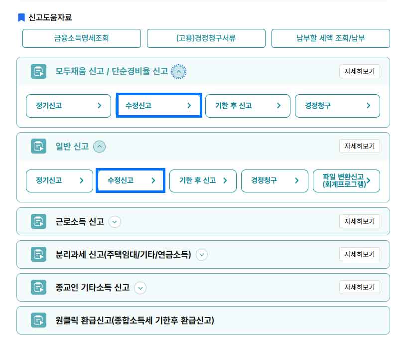 홈택스 신고 유형에 따른 수정 신고 메뉴 화면