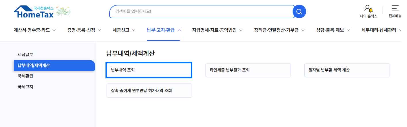 홈택스 메뉴 납부내역 조회 방법 스크린샷 화면