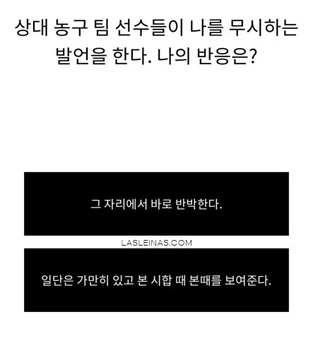 슬램덩크 첫 번째 문제는 상대 농구팀이 나를 무시하는 발언을 했을 때 나의 반응은? 인데요. 저는 일단 두 번째를 선택했습니다.