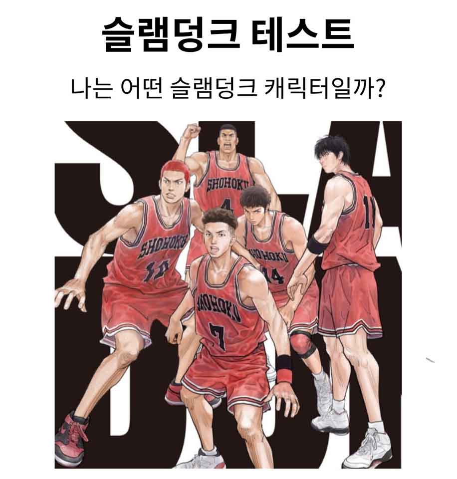 슬램덩크 열풍이 불면서 n회 관람은 물론 벌써 300만 명이 돌파해 인기를 재실감하고 있는데요. 저도 마침 오늘 두 번째 슬램덩크 더 퍼스트를 관람하고 왔습니다. 여운이 아직 남아 이것저것 검색 중 문득 슬램덩크 캐릭터들의 MBTI가 궁금해졌는데요. 검색 중 흥미로운 테스트가 있어 소개해드리려고 합니다. 테스트를 통해 슬램덩크 캐릭터 별 MBTI 유형을 볼 수 있었는데요. 아래에 링크도 있으니 한번 재미 삼아해 보시는 것도 좋을 것 같아요.