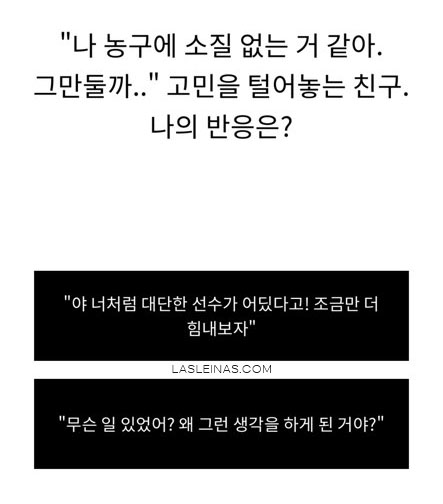 "나 농구에 소질이 없는 것 같아. 그만 둘까?"라는 친구의 말에 "무슨 일 있었어? 왜 그런 생각을 하게 된 거야?"라고 다시 물어볼 거예요.