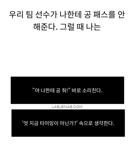 우리 팀 선수가 나한테 패스를 안 해준다. 그럴 때 나는? 속으로 '엇 지금 타이밍이 아닌가'라고 생각해요.