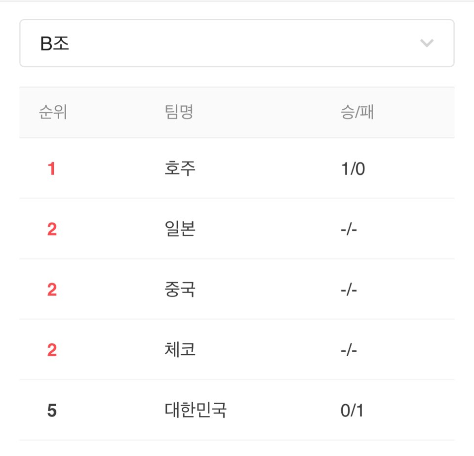 대한민국은 B조이며 한국, 일본, 호주, 중국, 체코가 속해 있습니다.
